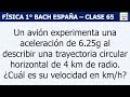 Un avión experimenta una aceleración de 6.25g al describir una trayectoria circular horizontal de 4 km de radio. ¿Cuál es su velocidad en km/h?
